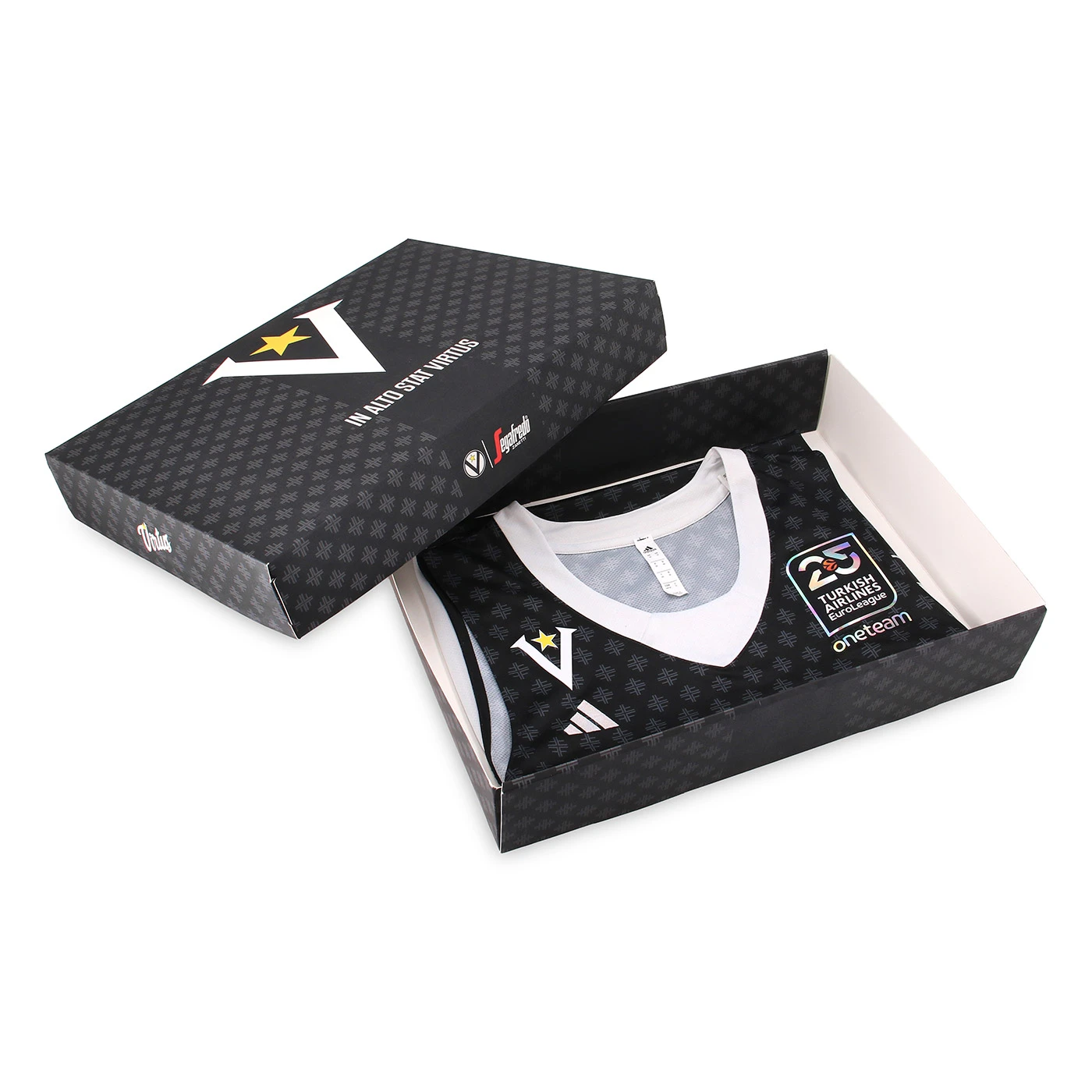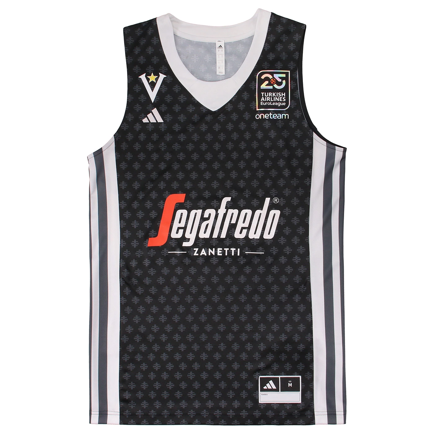 Virtus Segafredo Bologna celebrates the 25th anniversary of EuroLeague, the top European basketball competition. In its very first season (2000/2001), it was none other than the Black V that stood atop Europe, making history. Virtus was the first team ever - and remains the only Italian Club - to have won the prestigious title. To honor the legacy of the EuroLeague, a competition in which Virtus has played a key role, the commemorative jersey features a tribute to the first official emblem of SEF Virtus, the founding organization of Virtus Basketball. Created in 1875, this emblem consists of a shield with four "F" letters arranged in a cross, representing the values: "Forte, Franco, Fermo, Fiero" (Strong, Frank, Steadfast, Proud). Throughout Virtus' glorious history, these four virtues have served as a guiding principle for all those who have worn the Black V jersey over the years. In this special 25th-anniversary edition, the Black V returns in its classic form, just as it was featured on the team's game jerseys until the 1990s. The "Forte, Franco, Fermo, Fiero" kit is made from 100% recycled polyester, and the woven-design shorts ensure a lighter and more flexible fit.